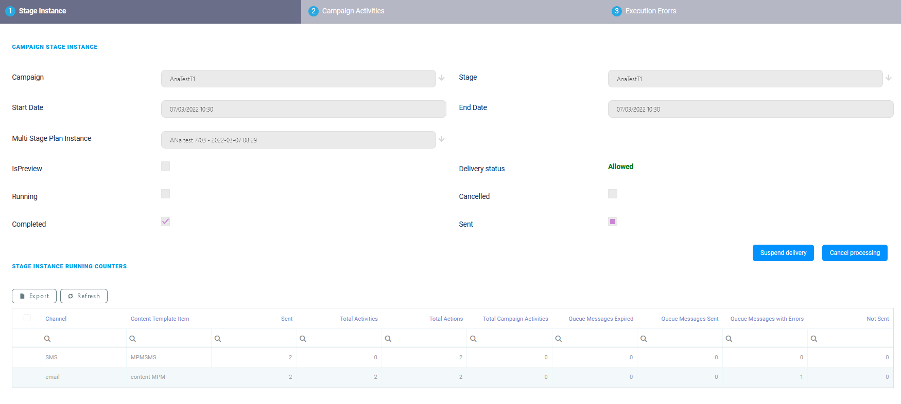 Suspend delivery: Use this button to stop the delivery of all the remaining messages that have not been sent to the recipient on that stage instance. In this case, messages are still created but are no longer sent to the recipients.