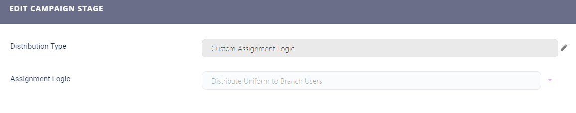 Assignment Logic | This field is displayed only for Custom Assignment Logic distribution type. The assignment logic runs for each internal campaign activity when the campaign manager or segment manager selects the Custom Assignment Logic option and uses one of the available custom stored procedures. The following parameters are taken into account when defining the stored procedures: