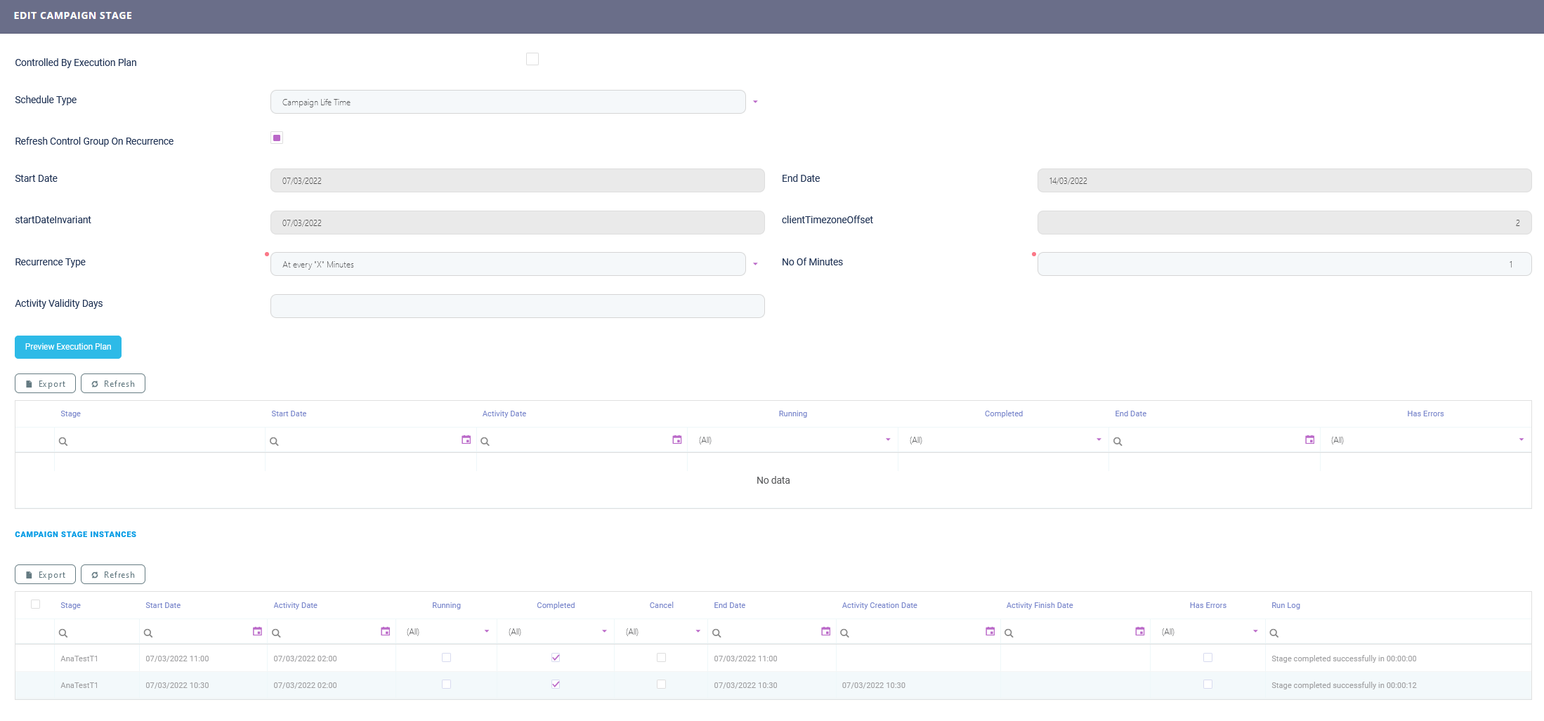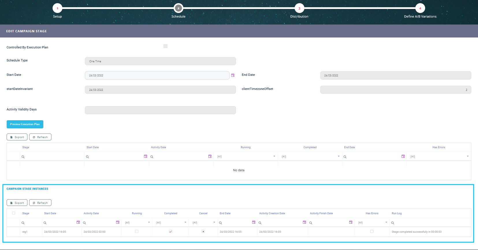 At stage level, this section populates once the campaign is in an Approved business status and when a stage instance is created for every stage run, showing the actual history of the stage instances that were run, not only a simulated preview. If the stage has a recurrence set, then a stage instance is created for every time that recurrence runs.