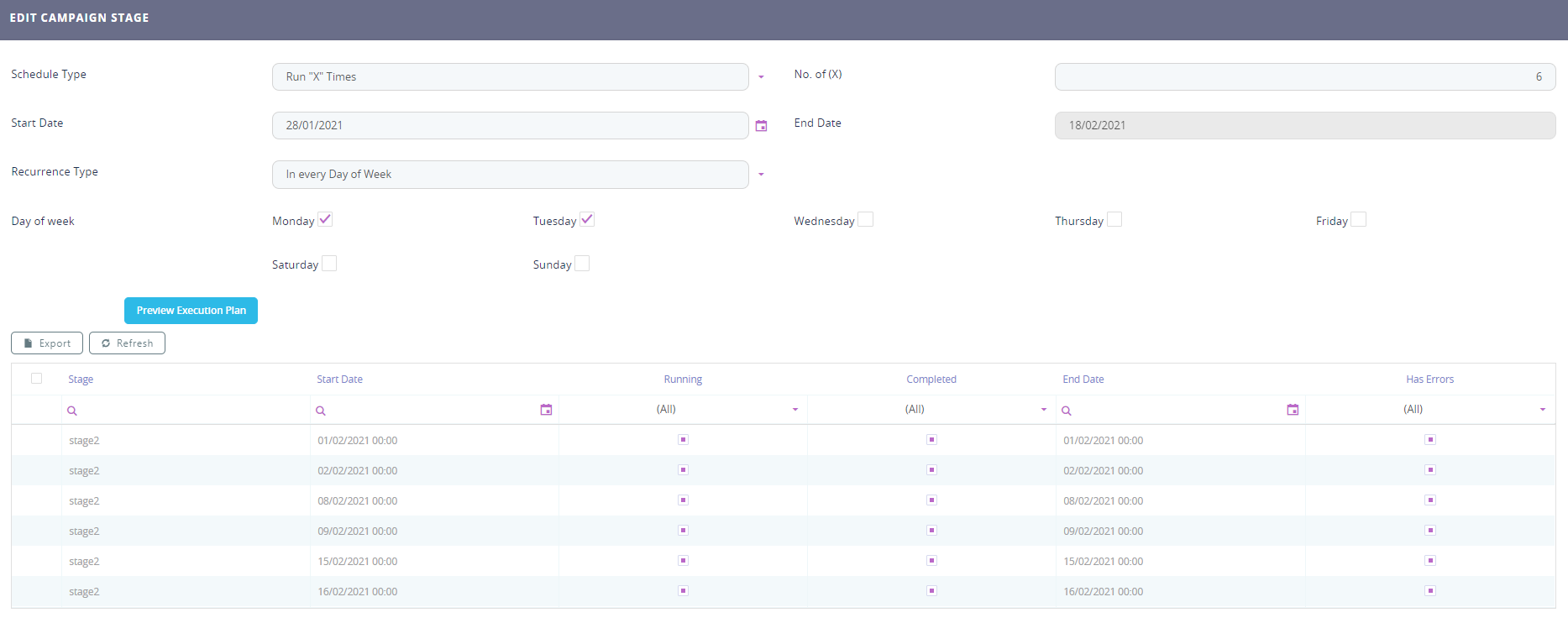 If the stage is set to run one time, only one stage instance is displayed while for stages set to run with a certain recurrence, the stage instances are created based on how many times the stage runs.
