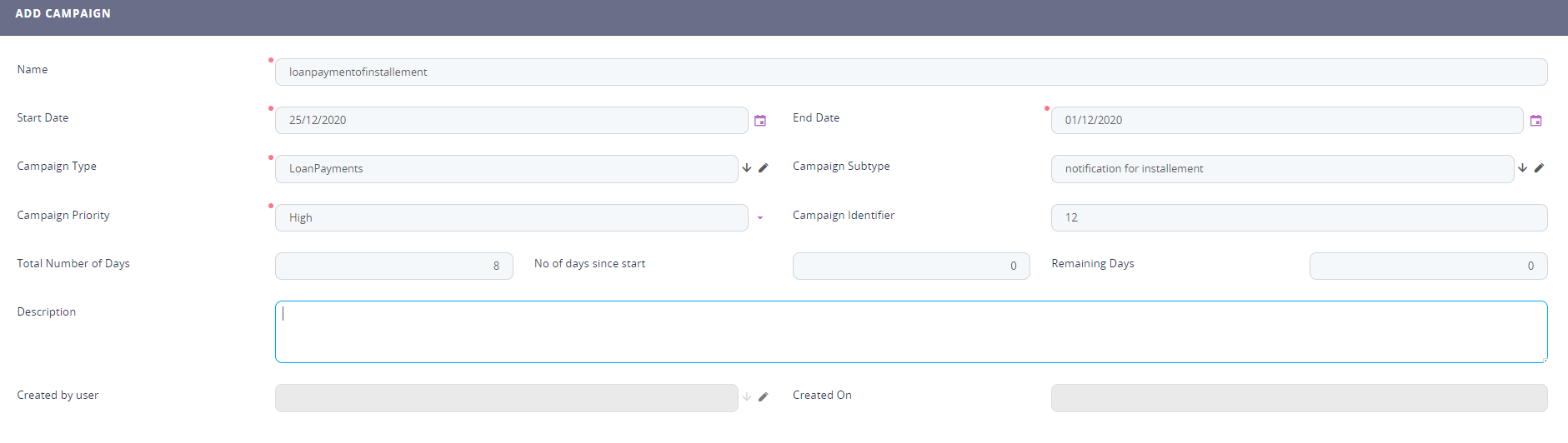 | Campaign Type | Yes | Lookup | The campaign type. It allows financial institutions to better organize between their campaigns. For example: Easter campaign, Summer campaign, or even a campaign that offers a special interest rate for a limited time period. For additional details, see the Managing Campaign Types page. |