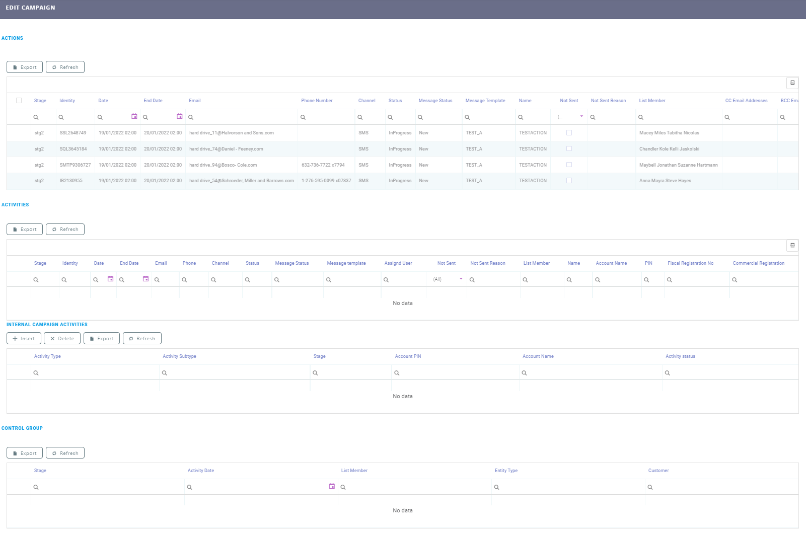 The Activities tab has four sections: Actions, Activities, Internal Campaign Activities, and Control Group for an overview of the campaign. In this step, the generated activities at campaign level are displayed.