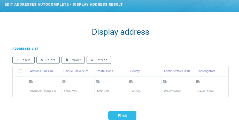 7. Click the Finish button. The FTOS_EXTD_POST_addressesAutocomplete List page opens.