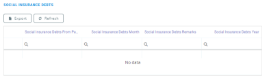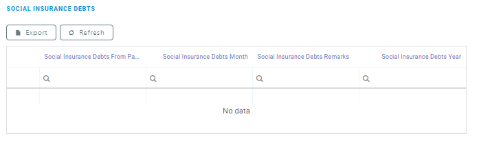 Once a company search is made, data regarding social insurance debts is stored in the Social Insurance Debts section. This section displays the information about public insurance that offers protection against various risks such as unemployment, loss of income, and others.
