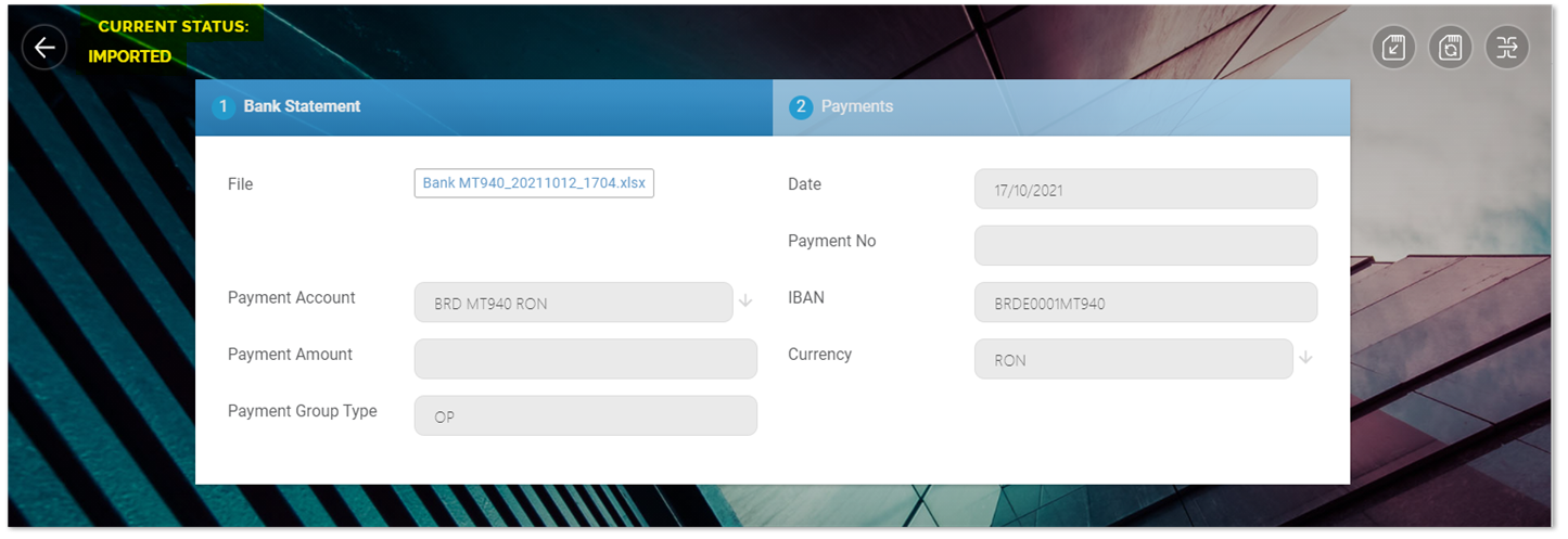 | Payment Account | From the dropdown, select the bank account standardized file type and click Ok. The current option set values are: BRD MT940 EUR, BRD MT940 RON, ING EURO, and ING RON. |
