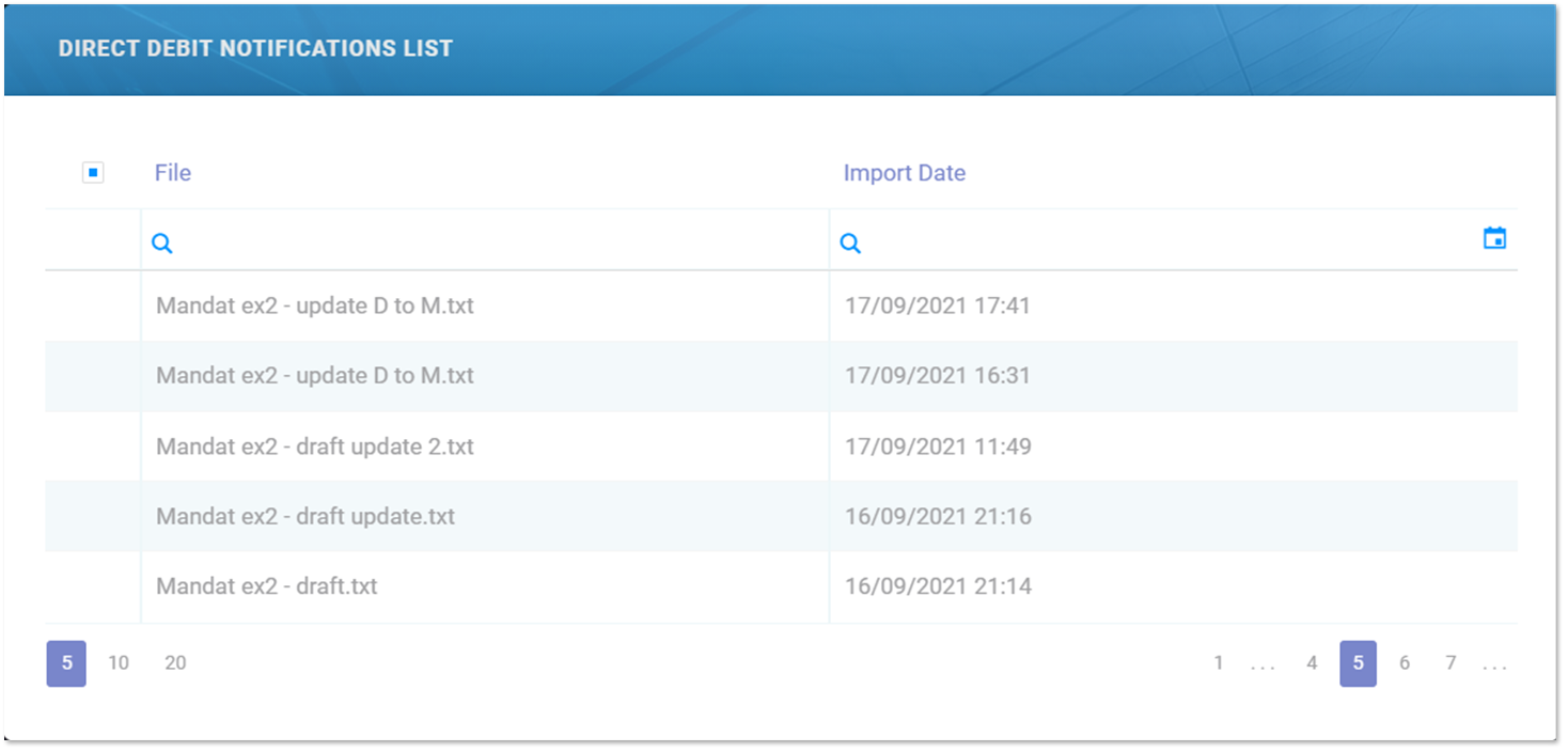 The Direct Debit Notifications sections displays all the files that contain notifications about changes made on the direct debit mandates registered on the system. A notified mandate is a mandate that received an update.