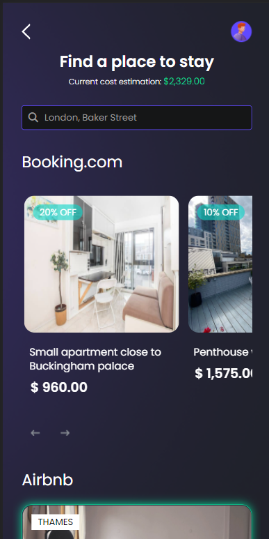 The system uses the dates of the trip to find, filter, and propose locations that are suitable. The details about a location are a picture, the name, the type of stay, the address of the accommodation, a review score, price for the entire period.
