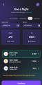 Below, there is a list of fights operated by different companies depending on the time, locations, and filter selected on the top of the page. Select a flight. The current cost estimation is updated when there is a selection.