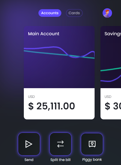 The top part of the homepage allows a user to navigate between the owned accounts and the cards. In the Accounts section, there are available: