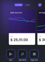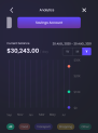 Each account has a chart displaying the fluctuation of the balance and the current value of the balance alongside the currency. To navigate between accounts, swipe left and right. The values are updated when the account is in the forefront of the screen. For each account there are three buttons available: