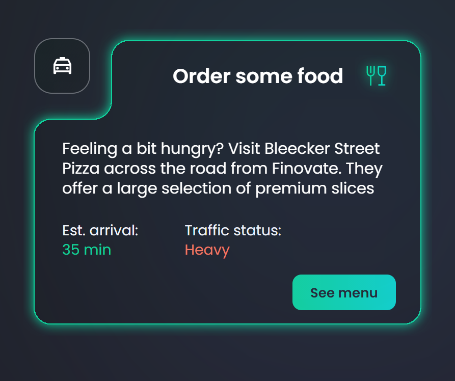 The following section contains a smart app section for the user to order food or hail a car ride and also use the time of day and GPS location to provide some highly tailored actions for their needs. Considering the geographical location and time of day, there are dynamic suggestions such as a ride home.
