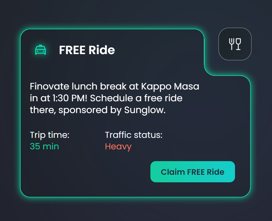 Finovate Conference is over in 1 hour! Schedule an UBER. Since you are at Finovate, the trip back to hotel is complementary, sponsored by Sunglow.