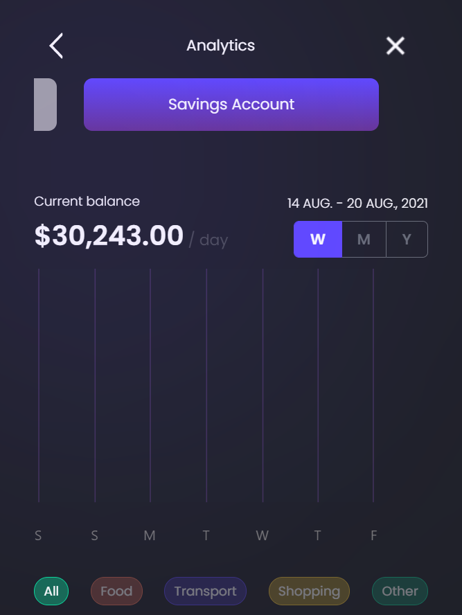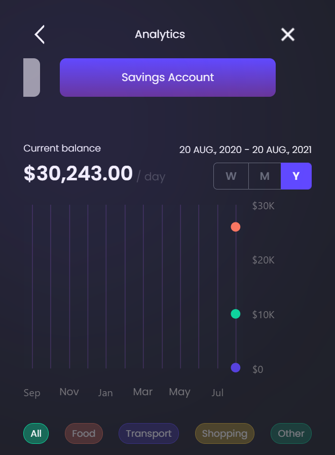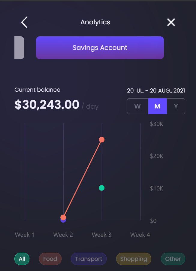 By clicking on one of the accounts, the Analytics page is displayed with details about that account in particular: spending, transactions and a daily budget tracker. The customer is able to select another account to view details for that particular account be it the main account or credit card or a savings account.