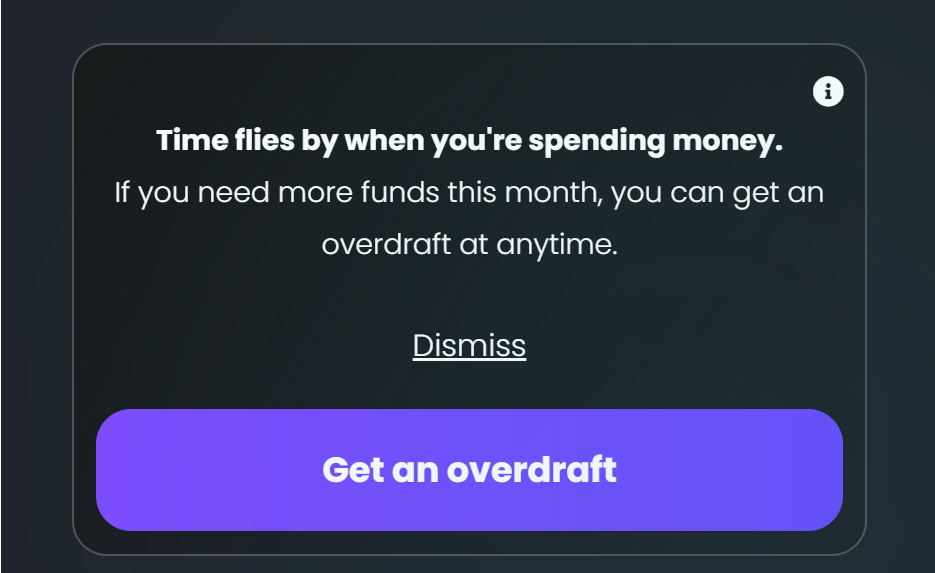 This section contains the overdraft suggestion to the user. It calculates the expenses of the customer and if the customer is likely to empty the account until the following payday, a product proposal for an overdraft is given to the customer. By clicking Dismiss, the message is deleted from the page. By clicking Get an overdraft, the overdraft flow is initiated.