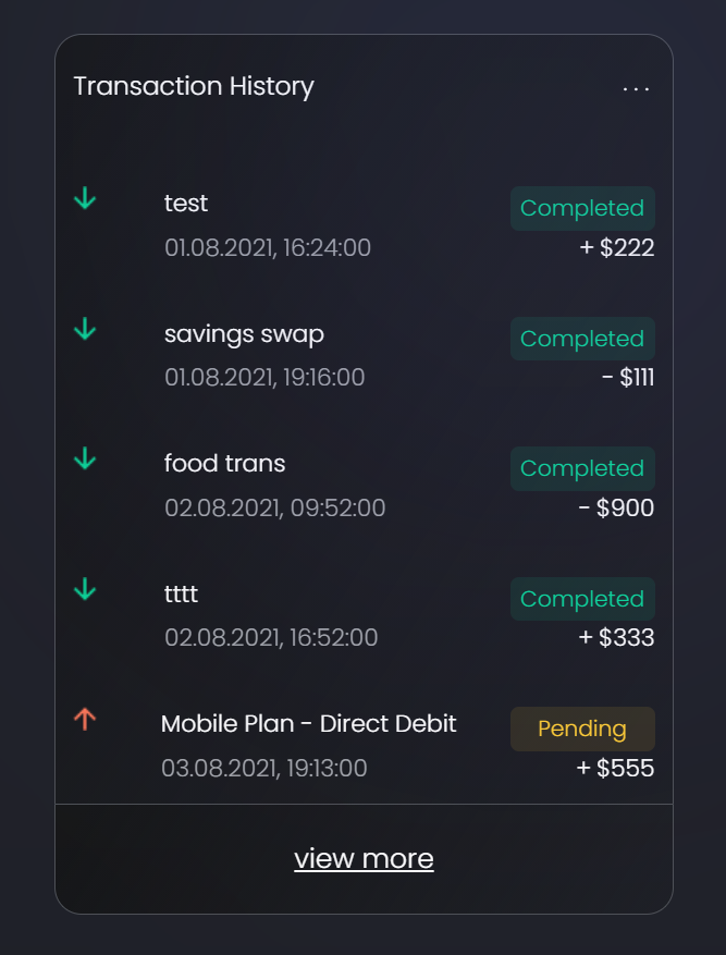 Under the transaction list, click View more to expand the list and display another five more transactions. To view all the transactions, scroll down the list.