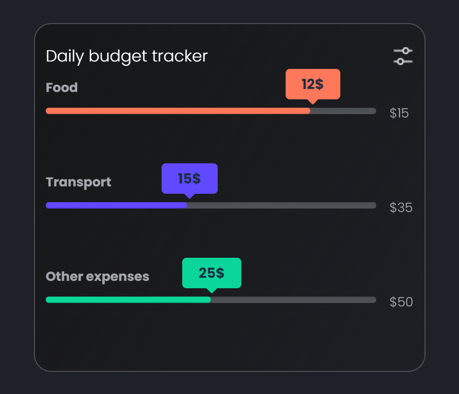 The daily budget widget displays how much they spend that day vs the daily budget set. The categories in place are Food, Transportation, and Other expenses. To edit the daily budget, click the Settings icon.