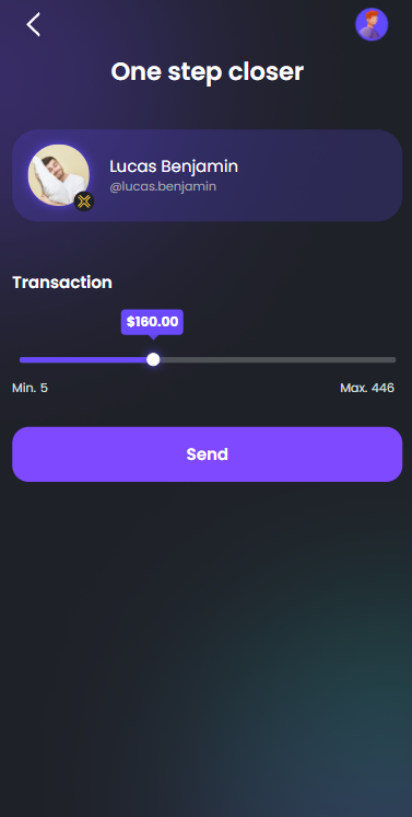 On the page One step closer, drag the slider left to right to select the amount, then click Send. If the transfer was successful, a toast message, i.e. a pop-up, is displayed to confirm the transfer.