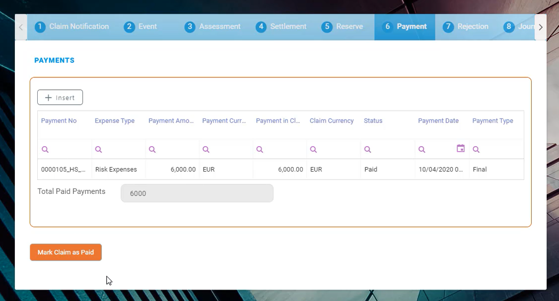 After clicking Paid, click Mark Claim as Paid or click Insert to add new payments.