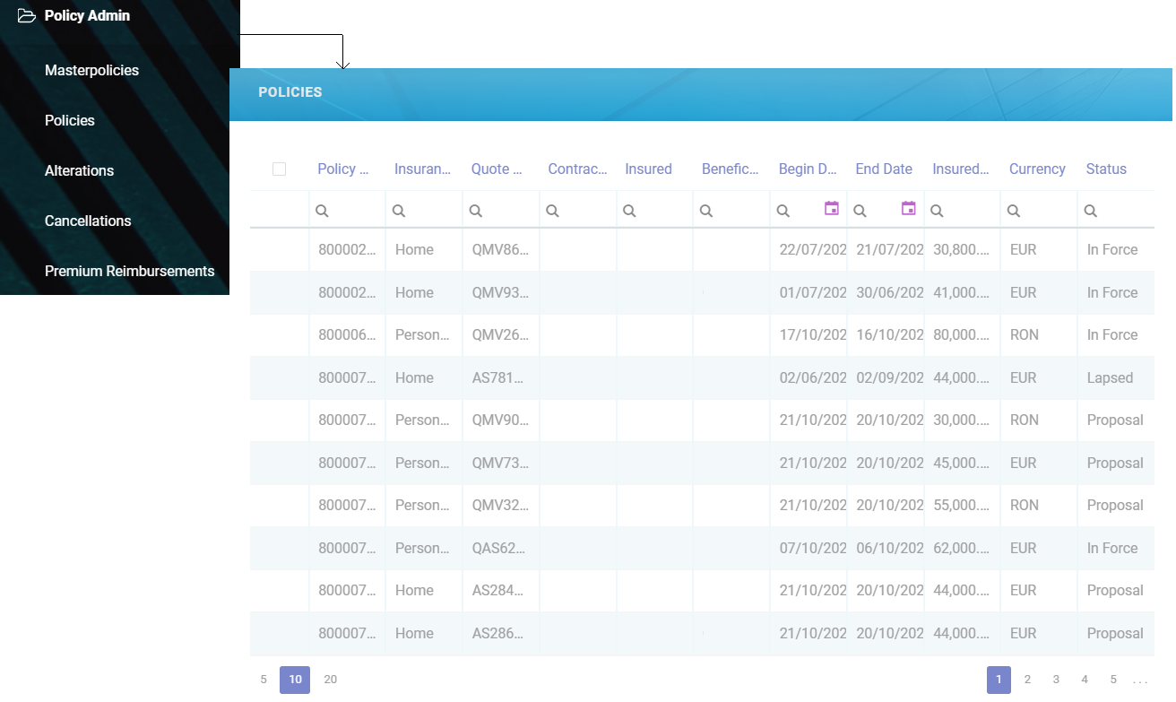 The Core Policy Admin solution enables you to store and manage a virtually unlimited number of digital policies. Use Policies when you need to have an overview of the repository of policies from your environment. It is also here where you see the latest Policies generated into your system. However, for an in depth analysis of your portfolio, use Policies Report to extract the needed data.