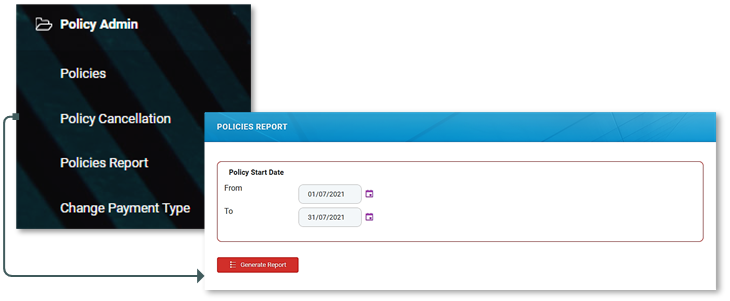 - Click Policy Admin and then select Policies Report from the drop-down.