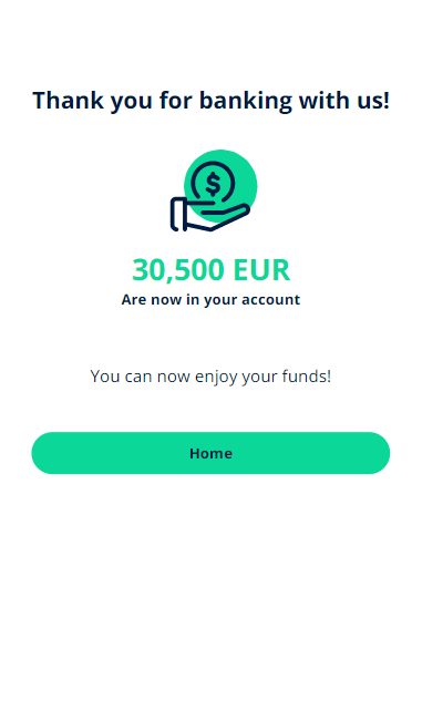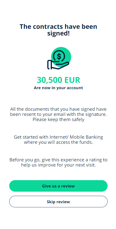 After the signature of the documents, the user arrives at the final screen where the information about the loan amount is presented. The status of the application is Disbursed.
