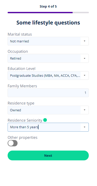 This step collects the scoring and eligibility data to determine whether or not a user can contract the requested amount. The scoring formula is paramount as it takes into account the data collected here (Age; Marital Status; Employment Status).