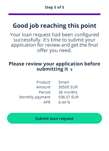 After the data for eligibility and scoring was added and the Configuring the Business Formulas automation processor approved the potential customer, they can send the loan application to be reviewed. During this time the databases from ANAF and Credit Bureau are queried by FintechOS Studio using server-side scripts presented in ANAF & Credit Bureau Integration. The final result is equal to the FICO SCORE plus the application score.