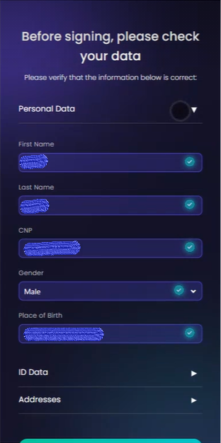 The potential customer has given the following information using one of the three methods available (scan ID, use NFC and Open Banking). If it was collected wrongly, they can edit the following fields, which are already completed with the data collected earlier.