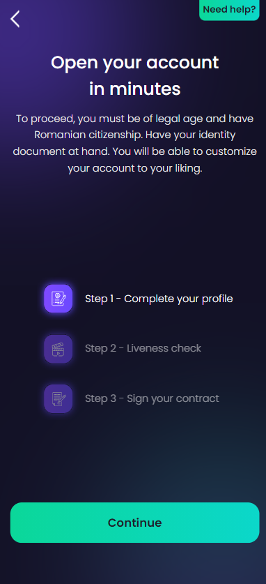 The second screen explains the necessities for the process. It is meant to guide the customer, and give some details about what to expect. In order to apply the potential customer must meet the following conditions found under the heading Open your account in minutes: