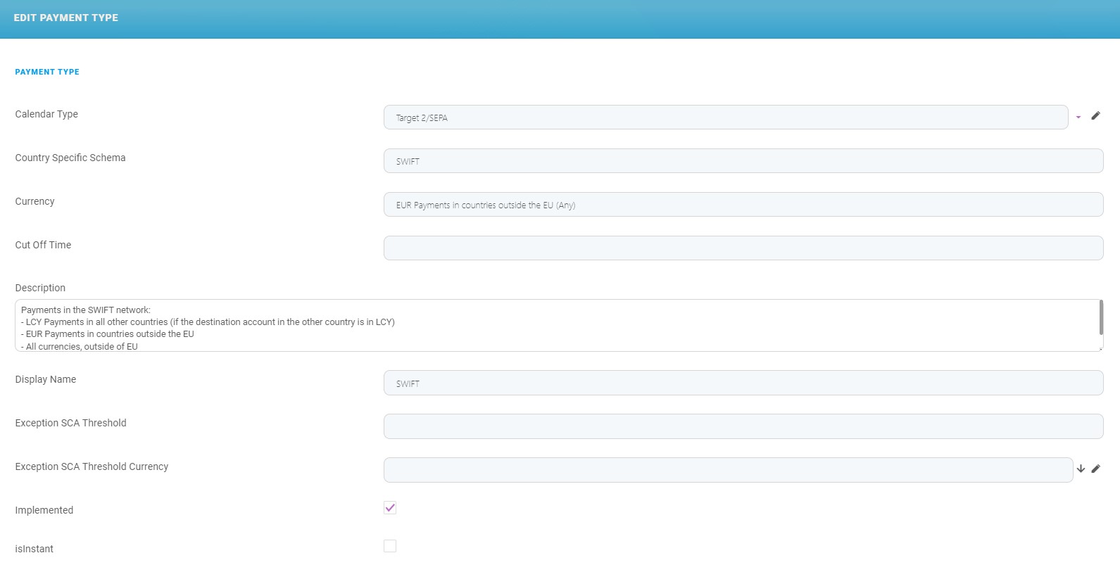 | PayentType - Currency | Insert the currency. | EUR Payments in countries outside the EU |