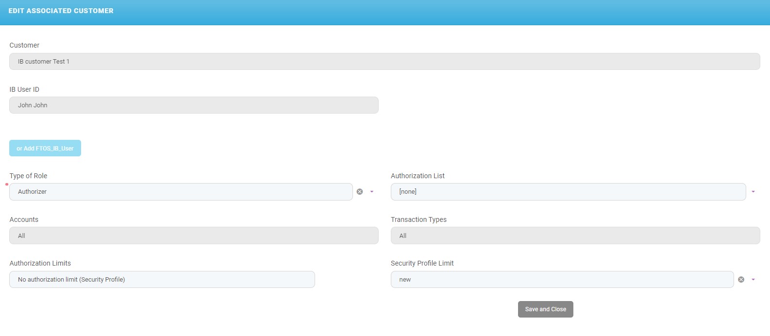 On the page Edit IB User, in the grid Associated Customers, select the customer. The User Client List page is displayed.