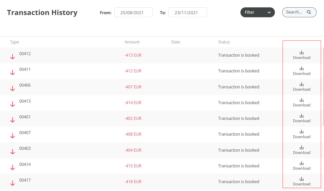At the end of each row of each transaction, there is the possibility to download the pdf with the transfer statement. Click Download to have the statement on the local device.