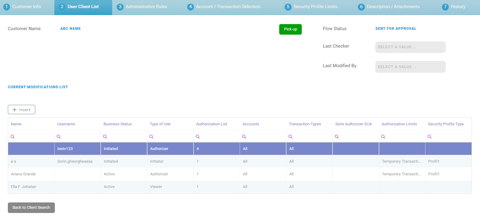 - In the section tab User Client List, click Pick up. The Pick Up button saves the value of the current admin user in all records that have the flow status