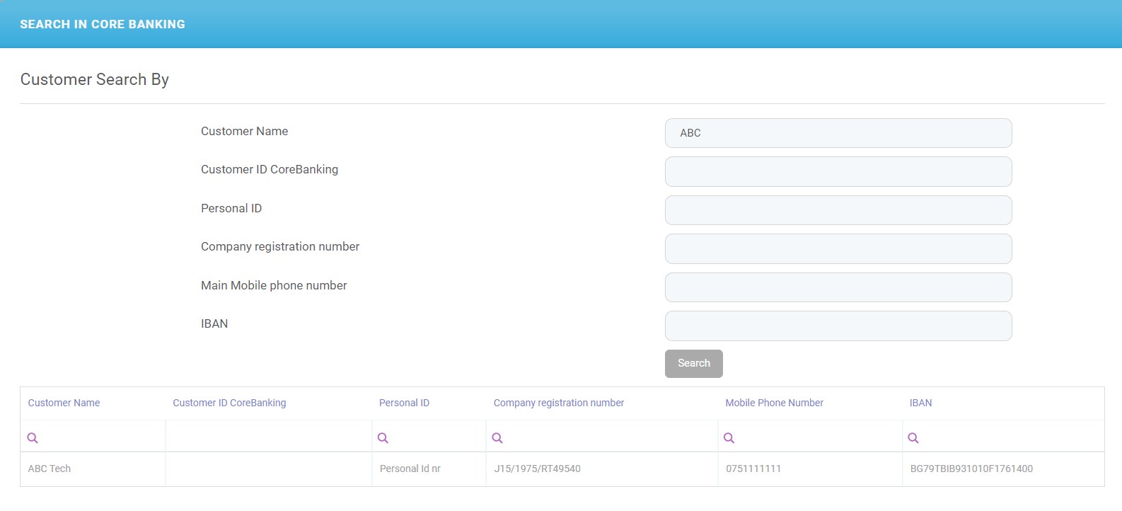 A bank representative can search for the customers in Core Banking as well through the use of the integration done through an endpoint. However, it is not possible to insert/ create new customers.