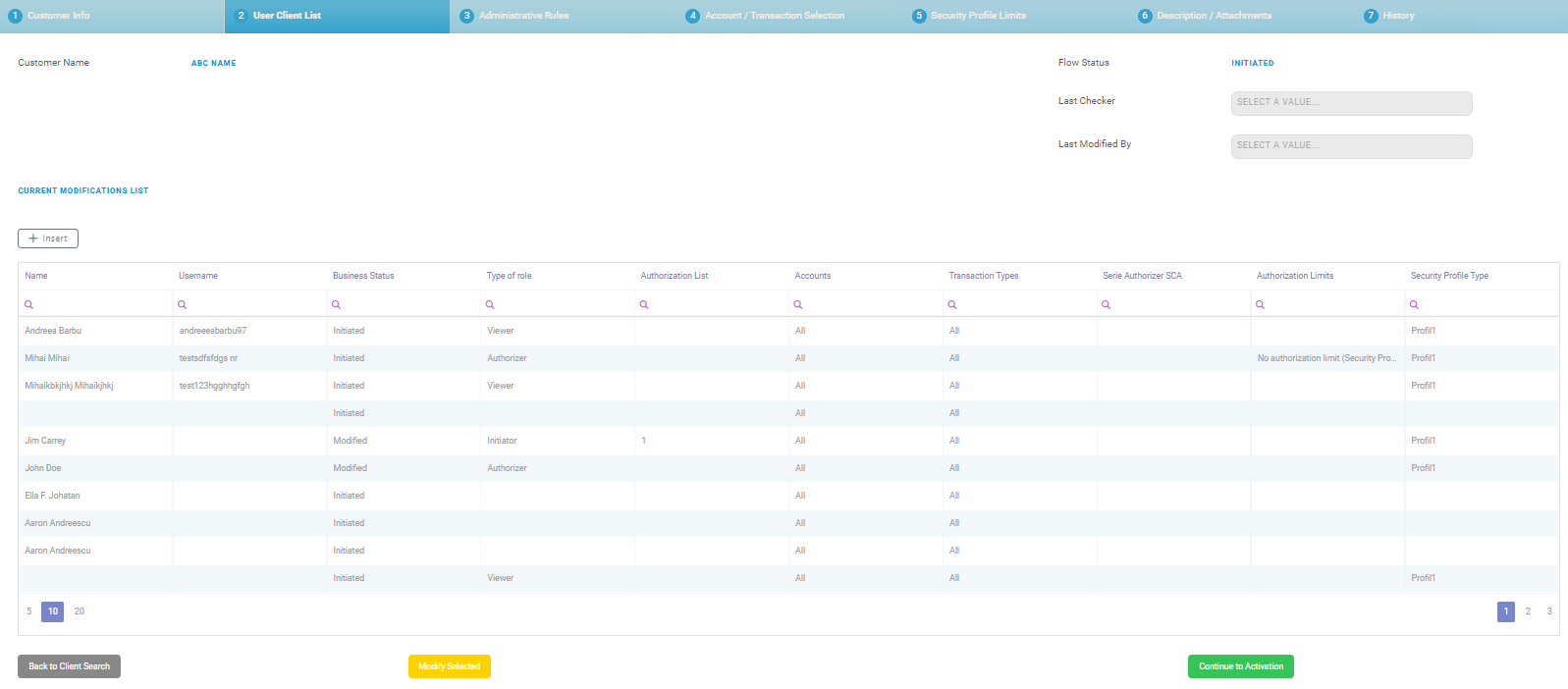 - On the User Client List page, navigate to the grid Current Modifications List.