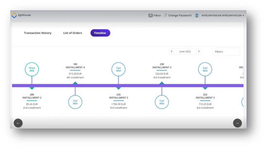The timeline has the installments displayed in bubbles that are color-coordinated. Green bubbles mark the paid installment, red bubbles mark the overdue due dates of unpaid installments. The first bubble in the schedule is the upcoming due date. For the timelines with multiple loans with the same next due date, then the order of the bubbles is given by the value of the total installment. The first displayed is the highest to smallest.