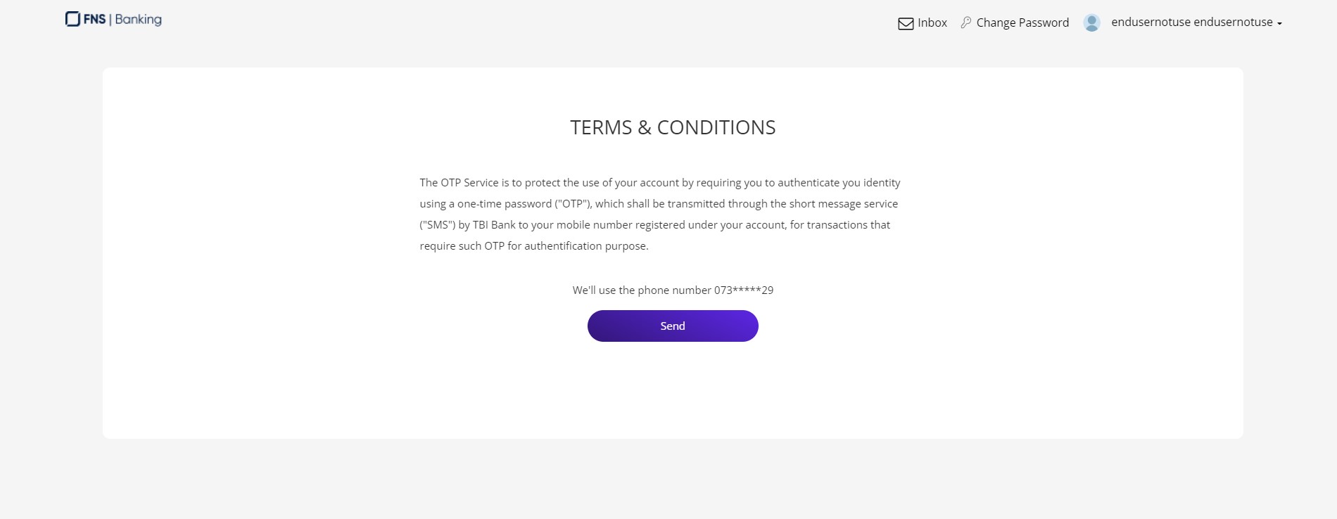 8. If the user has the rights, the page Terms & Conditions is displayed informing you that you need to insert an OTP sent via SMS to authorize the payment. Click Send.