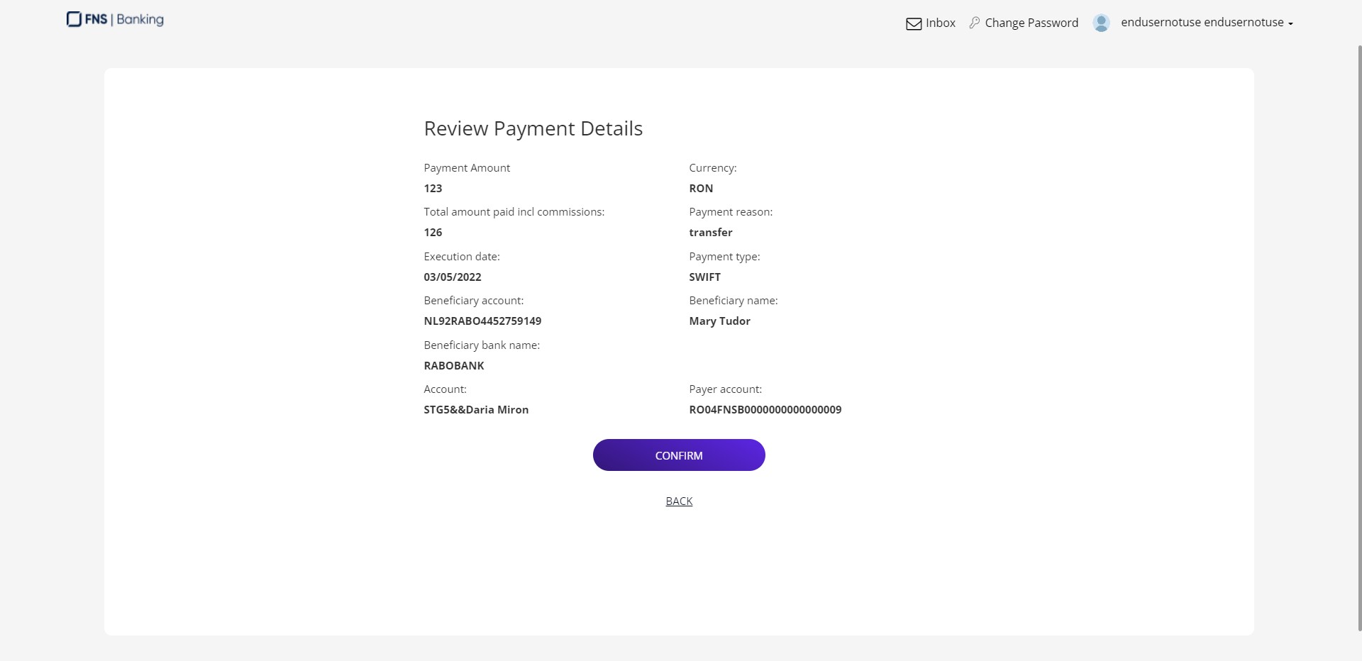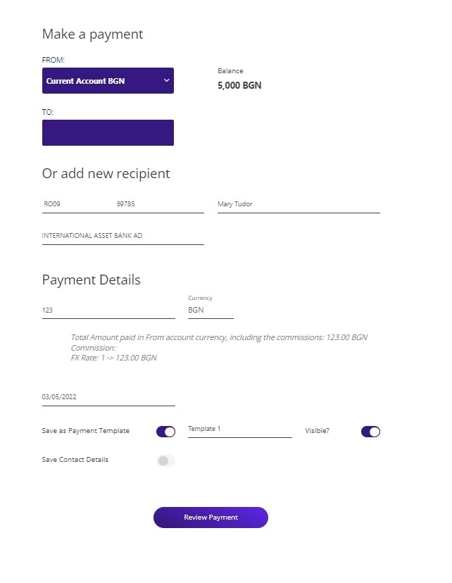 7. Click Review Payment. By clicking that button, if applicable, the payment template and the beneficiary template are saved. The page Review Payment Details is displayed. It contains the read-only data: