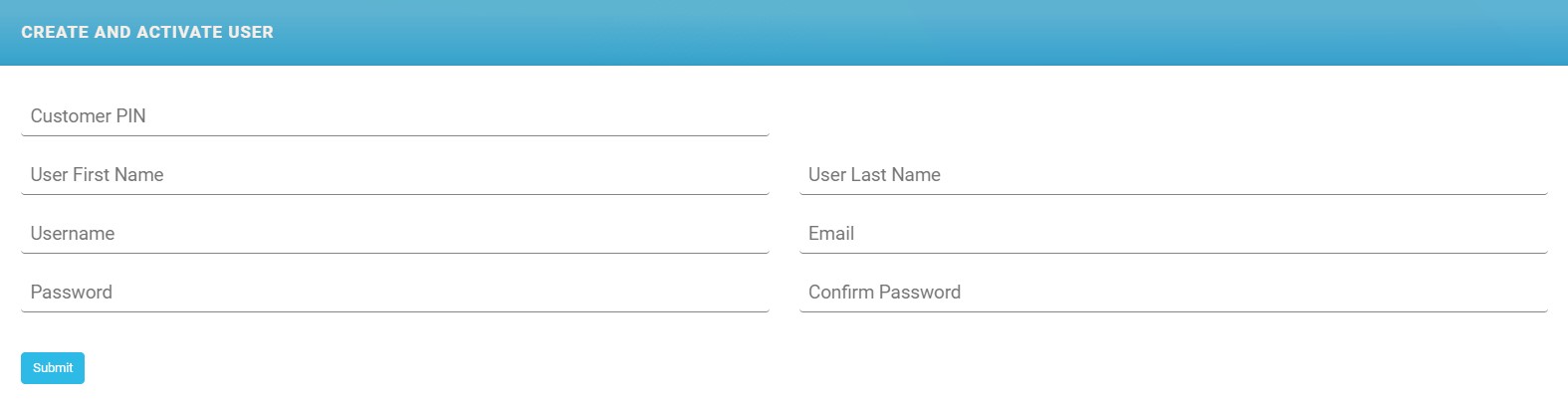 Field Mandatory Description Customer PIN Mandatory Insert the user's Personal Identification Number. User First Name Mandatory Insert their first name. User Last Name Mandatory Insert their surname. Username Mandatory Insert a unique username (used to log into Online and Mobile Banking). It must contain 10 characters. Email Mandatory Insert the user's email. It must be unique in the database. Password Mandatory Insert the password. The password must match the password policy in place. Confirm Password Mandatory Re-insert the password. - Click Submit. The outcome is that the user is associated with the customer, the status is