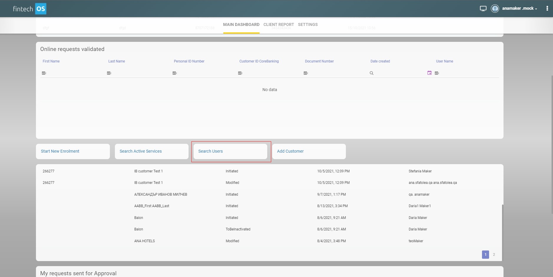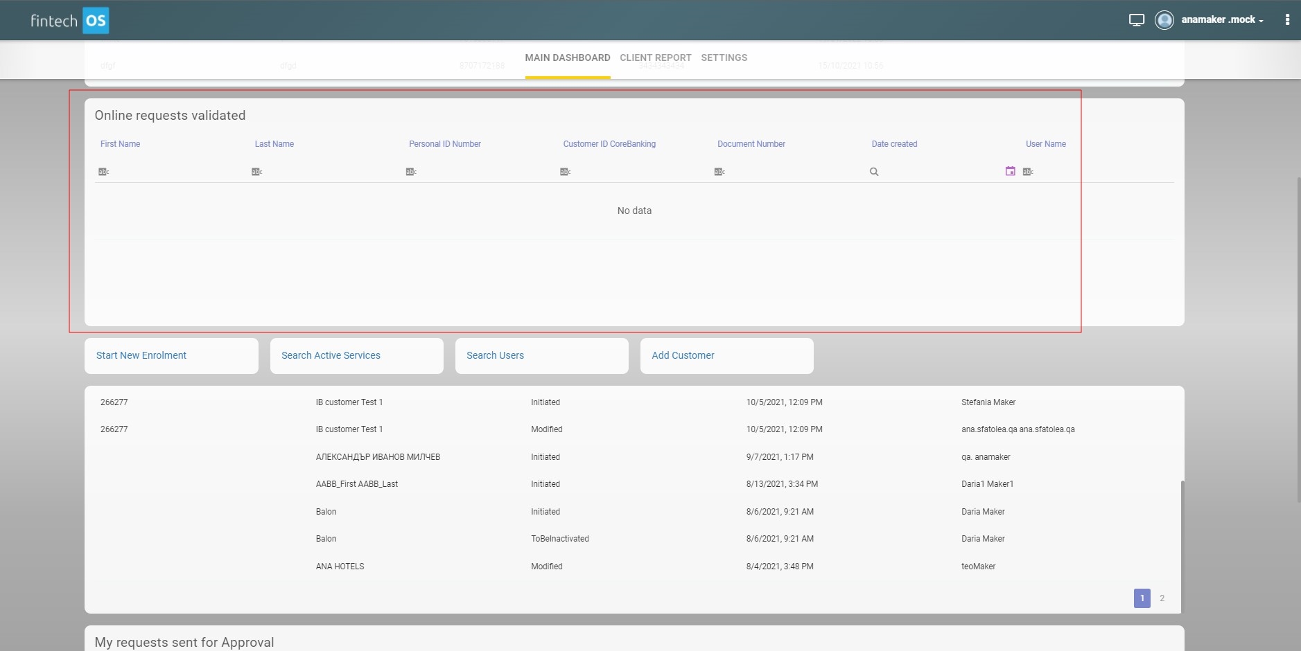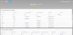 • Online requests not validated, i.e., the user was not associated to a customer of the bank. The view displays the list from the most recent entry to the oldest. It displays the users' requests not created online successfully.
