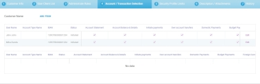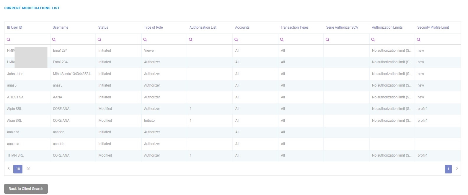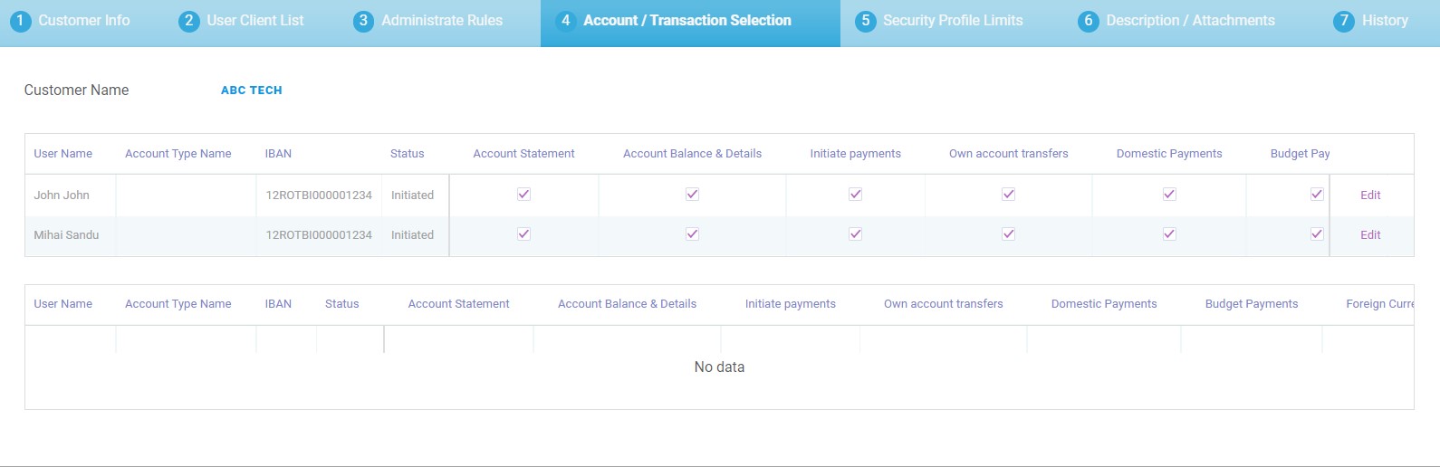 Depending on the rights given to a user in The grid Current Modifications List for each of the users of a customer, the users are displayed with the associated bank accounts: