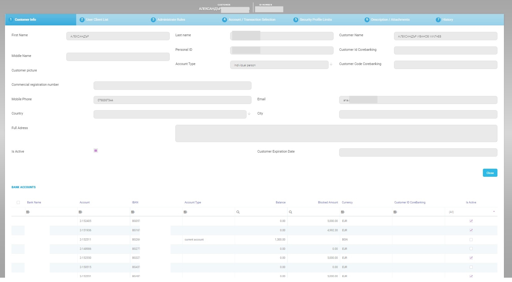 In the second tab named The grid Current Modifications List, when selecting a user, the fields Accounts and Transaction types are read-only and have the default value All. From this tab named Transactions, clicking the button on the end of the row for each bank account edits the values from All to Selected in The grid Current Modifications List depending on what was ticked or un-ticked here.