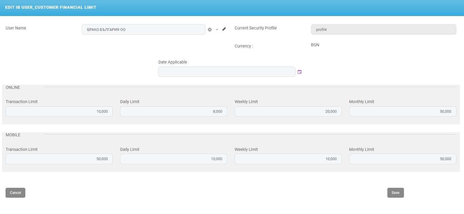 Monthly LimitNumericInsert the amount of money that servers as a maximum monthly amount allowed to be transferred through all payments done using the mobile banking channel for that security profile.