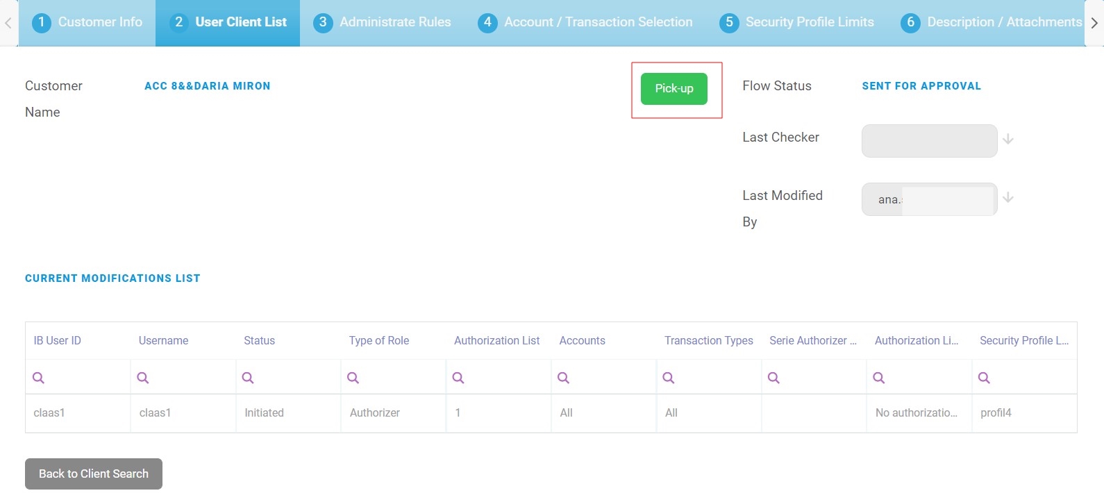 4. The section tab User Client List, click Pick up. The Pick Up button saves the value of the current admin user in all records that have flow status Sent to Approval and triggers the system to automatically change the flow status for all records in Sent to Approval to In Progress Approval.