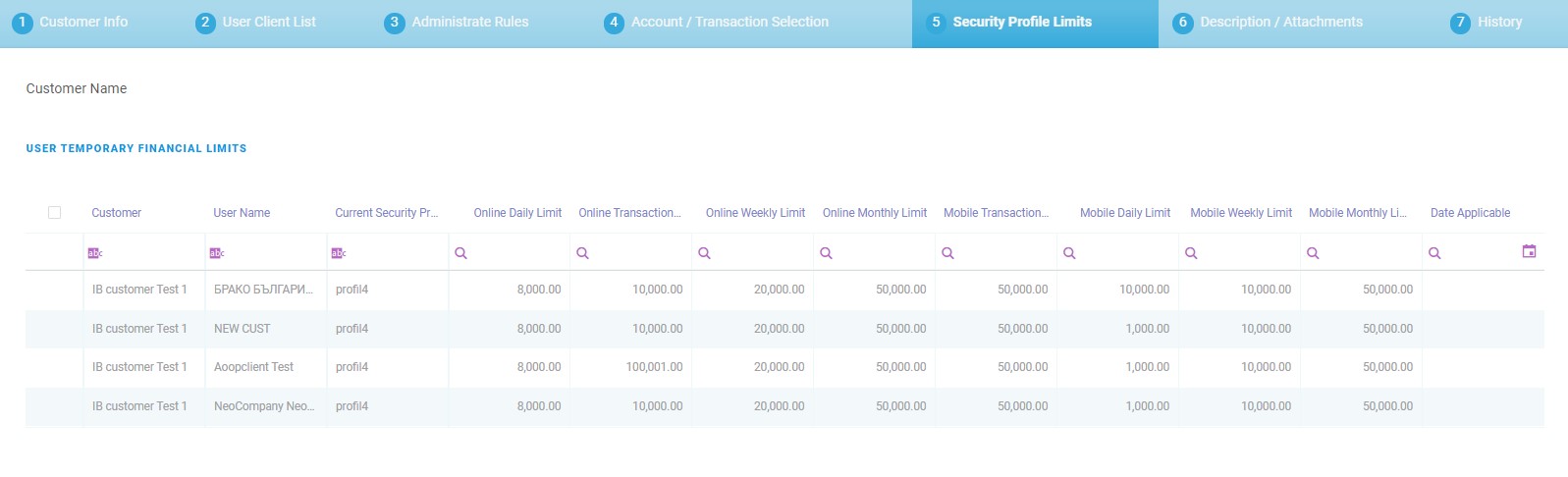 This section tab displays the exceptions to the security profiles of the users, i.e., one limit or more can be modified here and the modification is valid for one day/a week/a month.