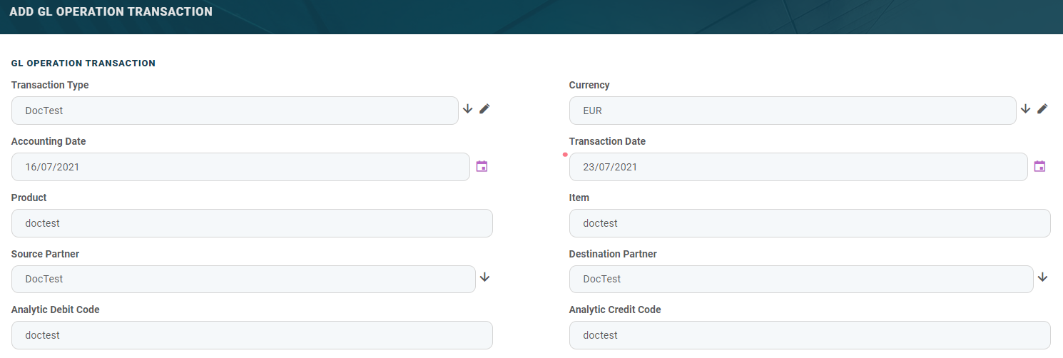 5. Click Save and reload. The Operation Transaction Values and the Accounting Entries sections are displayed.