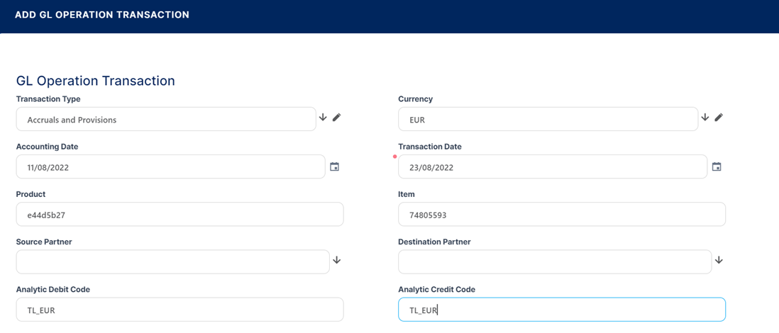 Click the Save and reload button. The Operation Transaction Values and the Accounting Entries sections are displayed.