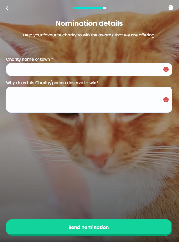 This screen allows the user to enroll their preferred animal charity for the insurer's awards. The aim of this screen is to make place for best practices in the insurance industry, since charity award nominations are arguably improving customer engagement and have a positive effect on the insurer's Net Promoter Score (NPS). For this step, the values inserted by the user are stored in the Pet Quote entity.