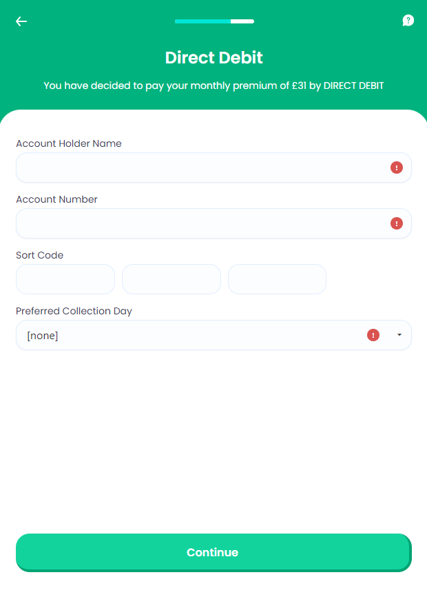 | Supporting Text | The following supporting text is displayed under the heading title: You have decided to pay your (selected frequency) premium of (calculated premium amount) by DIRECT DEBIT |
