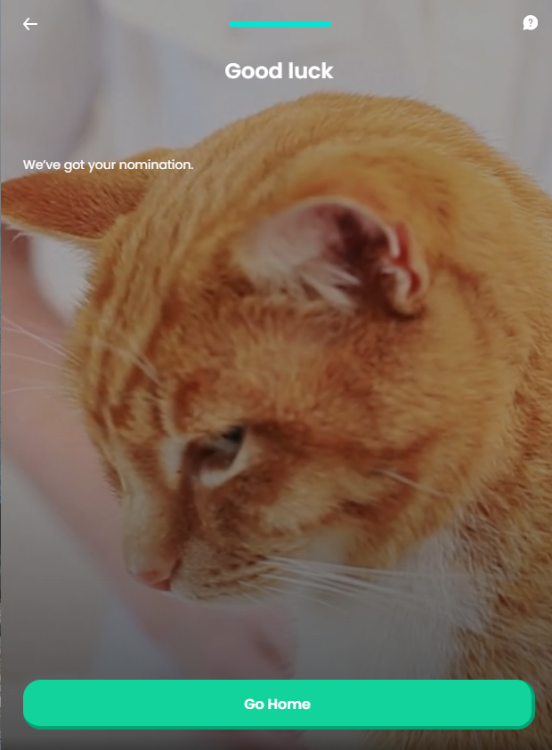 In attempting to end the journey on a positive high note, this screen displays the success message with regard to the charity nomination.